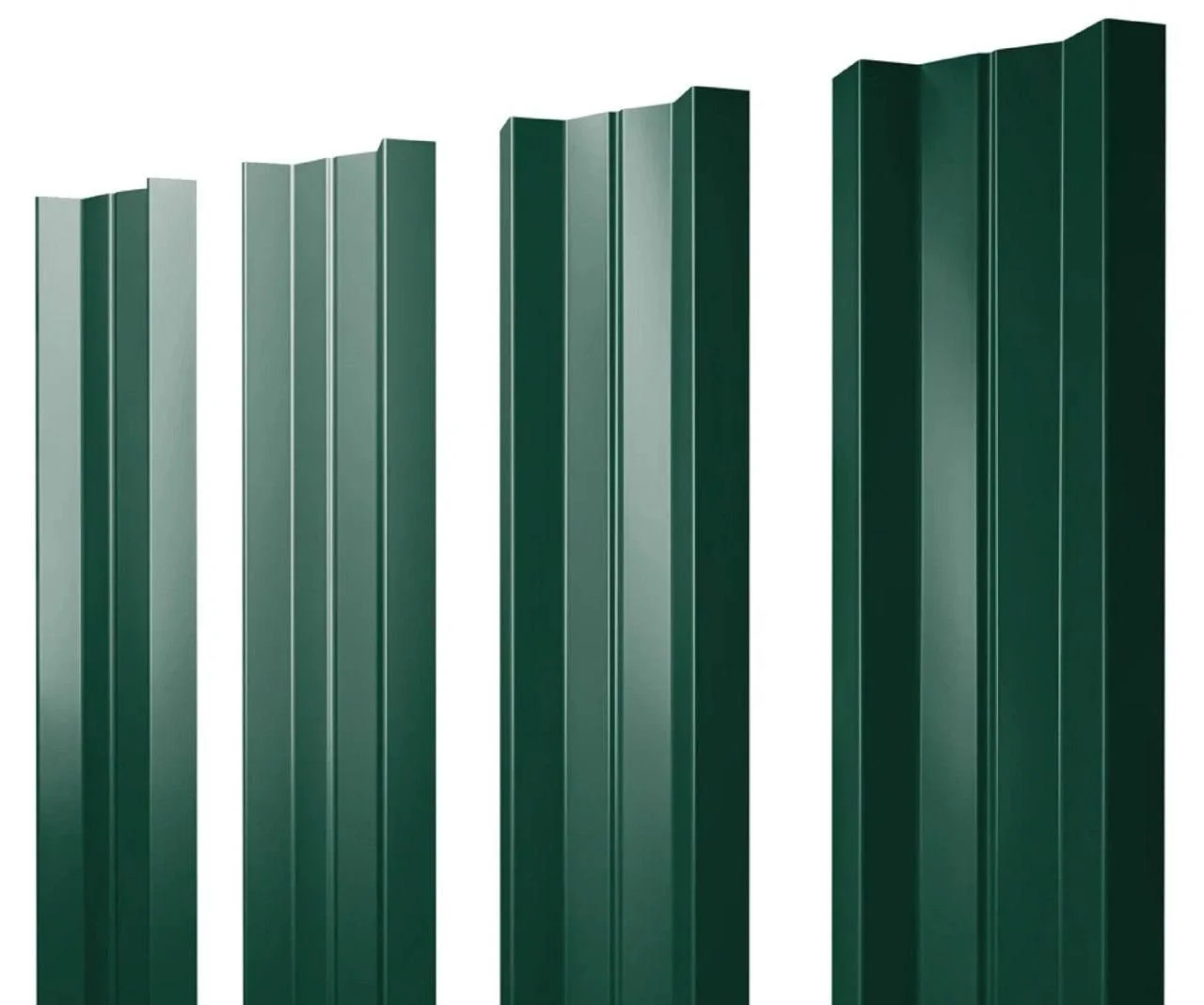 Уникальная форма. Секция ограждения имеет выпуклую во внутреннюю сторону центральную часть. По бокам евроштакетника м-образного 0,45x110 мм зелёного ral 6005 1м располагаются дополнительные ребра.